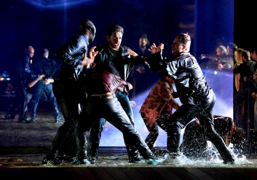 Я не увидела причины для воды в центре сцены. Многие члены хора в нее погружаются и подымаются, промокшие. Наверное, этим подчеркнута опасность, которая грозила иудеям?
